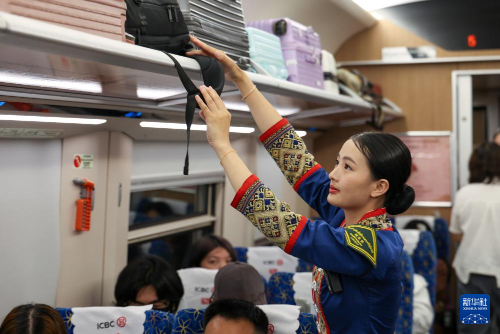 4月15日,列车长国茉莉在D87次中老铁路国际旅客列车上工作。新华社记者 陈益宸 摄